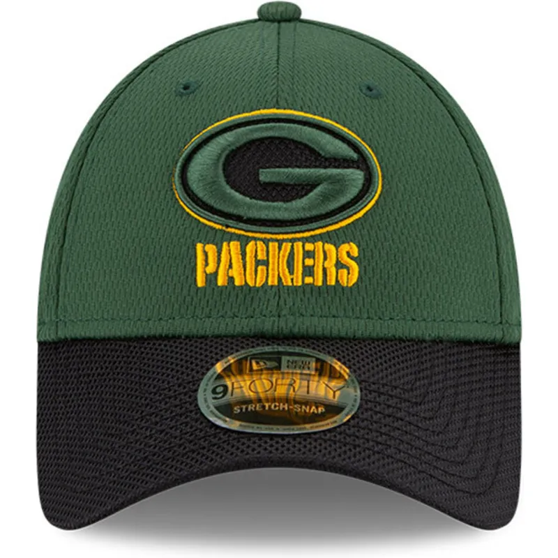 New Era Curved Brim 9FORTY Stretch Snap Sideline Road Green Bay Packers NFL Green and Black Snapback Cap